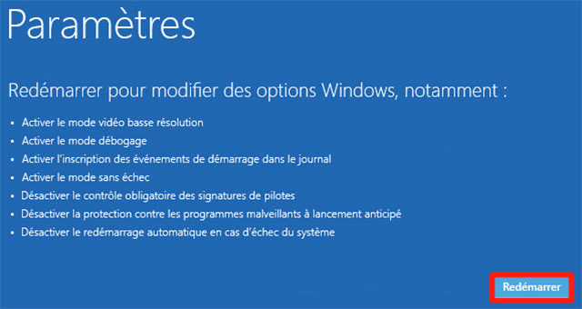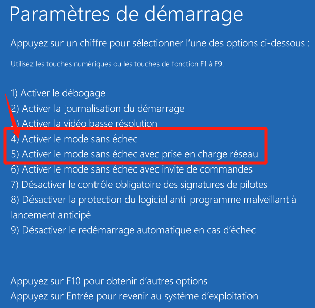 6. Après le redémarrage, vous entrerez dans le menu de paramètre de démarrage. Touchez sur « 4 » à votre clavier pour entrer en mode sans échec.
